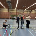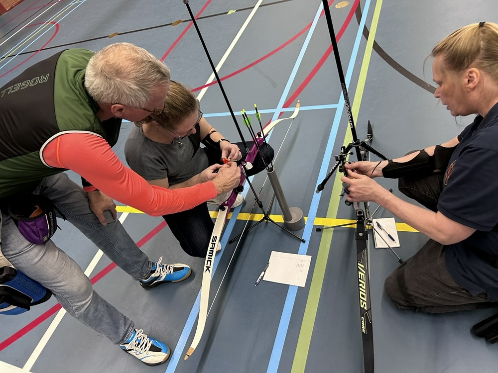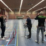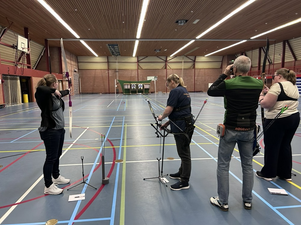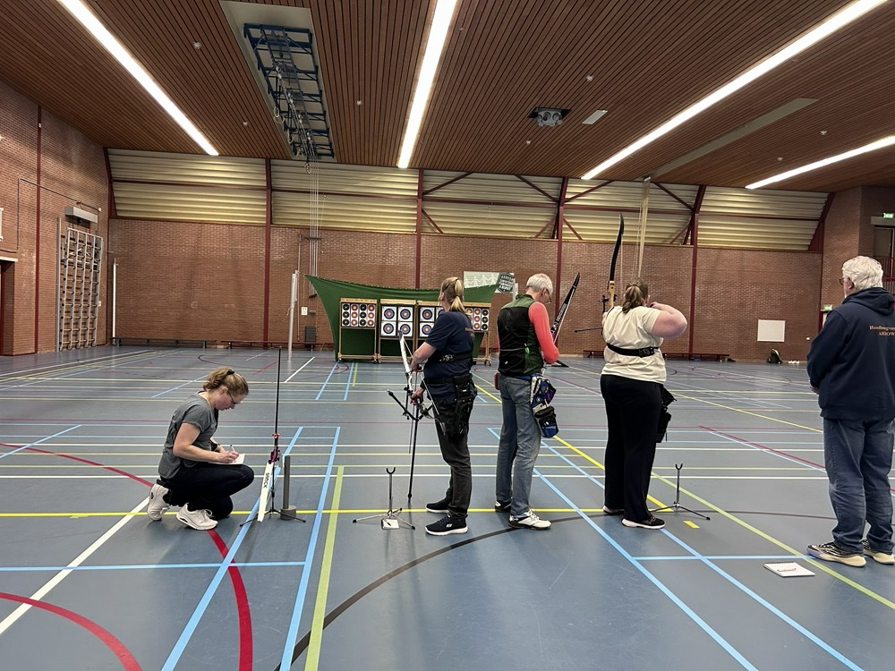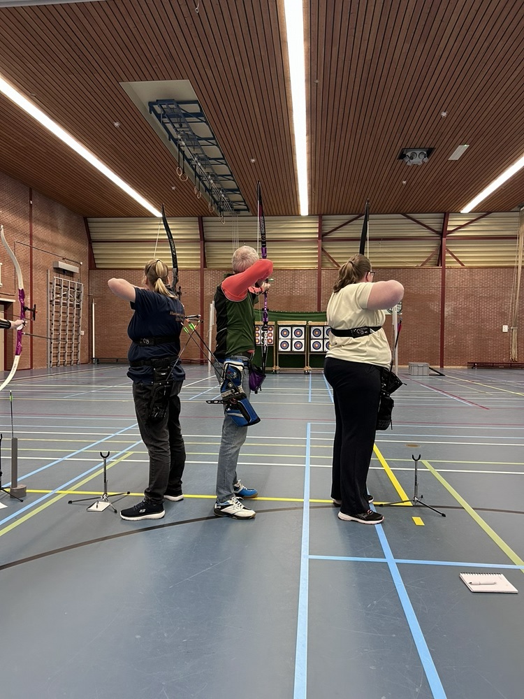Voordat we naar Warnsveld gingen, moesten we natuurlijk eerst het vizier uitlopen. En dat deden we deze keer in de sporthal! Een mooie manier om rustig in te schieten en scherp te stellen. Vooral voor de nieuwe leden was dit erg waardevol; er werd veel geleerd, uitgeprobeerd en bijgesteld.